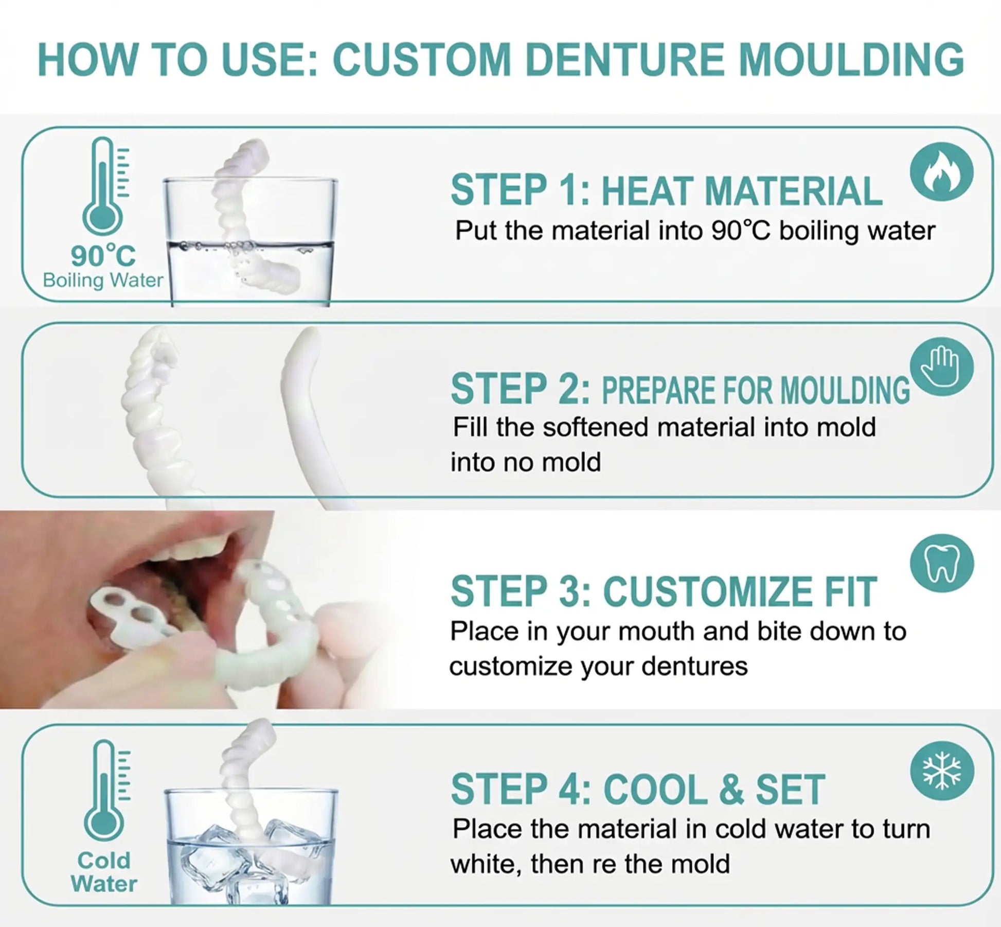 • Custom Fit: The veneers are moldable and flexible, allowing them to adapt comfortably to your teeth.